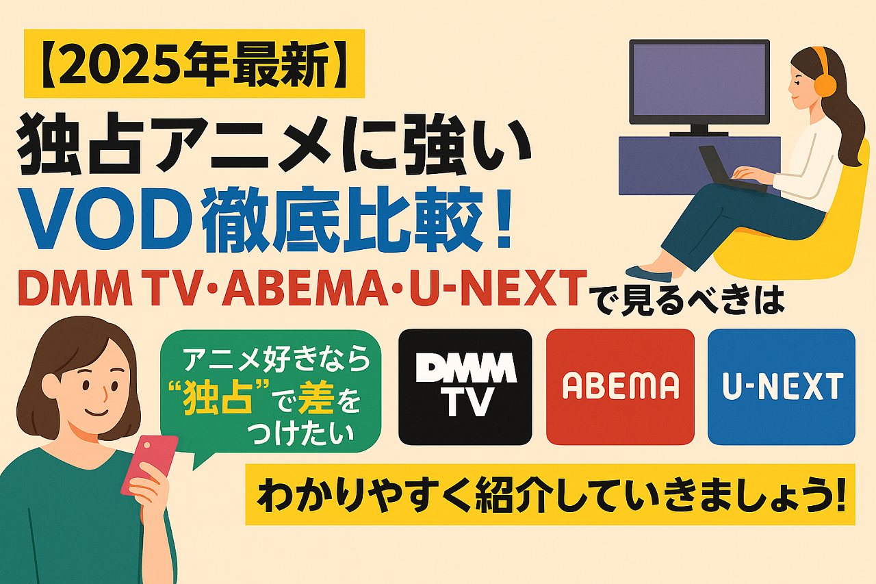 深夜アニメの最速視聴、円盤派も納得の高画質、グッズや舞台イベントとの連動など、独占タイトルが多いほど”推し活”も充実しますよね。今回はDMM TV、ABEMAプレミアム、U-NEXTの3サービスを中心に、「独占アニメに強いVOD」を徹底比較します。